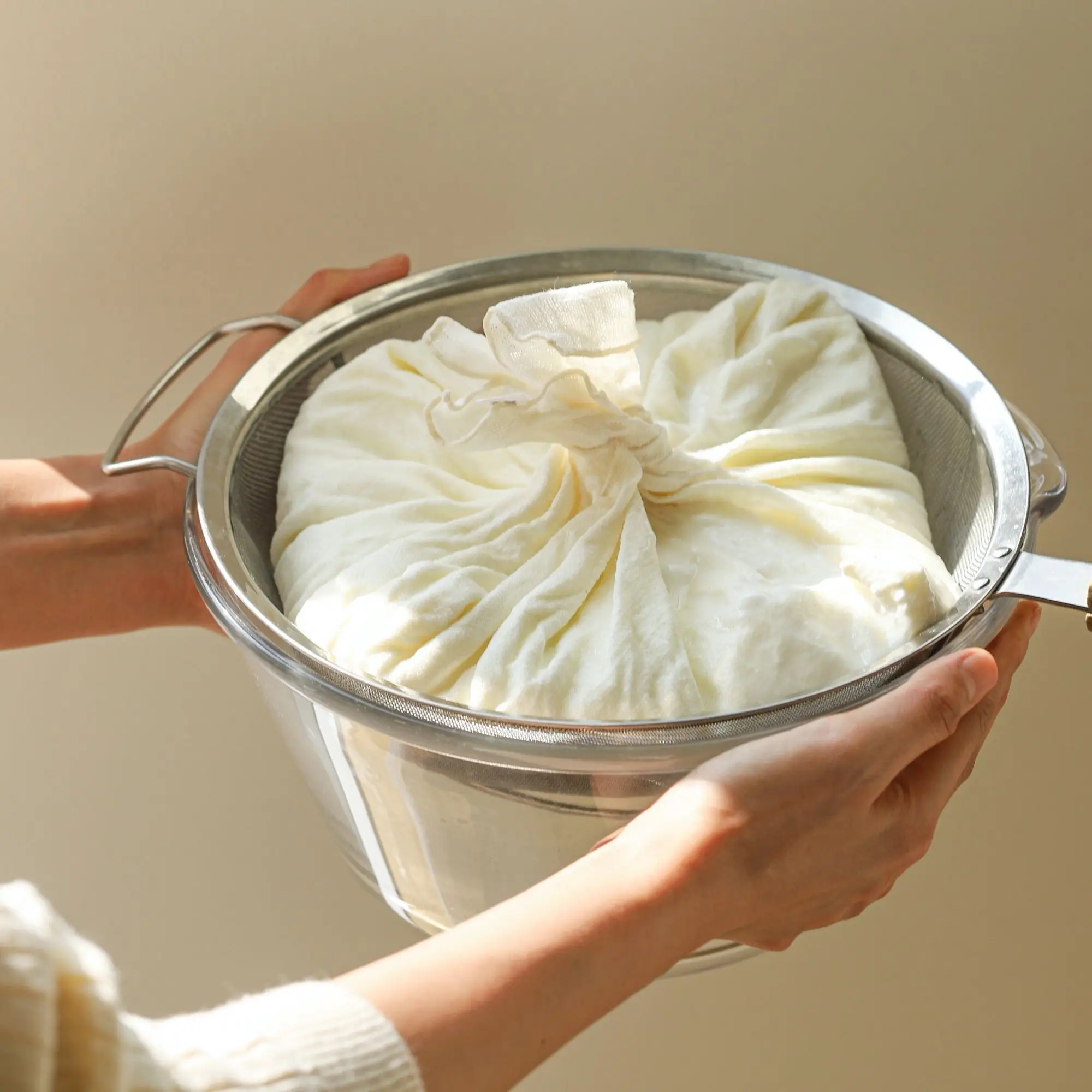 - 체와 치즈보 또는 요거트 스트레이너 (유청 분리용, 사용하기 편리한 도구를 선택하세요)